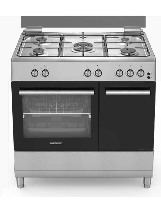 You're viewing: Campomatic 90cm Cooker with Bottle Compartment, 2 knobs, Gas-Gas, 4G + 1TB, Glass Cover with Full Aluminium Front Profile, Timer, Flat Matt Enamelled Pan Support, ignition, Slide out inner door, Full Body SS
