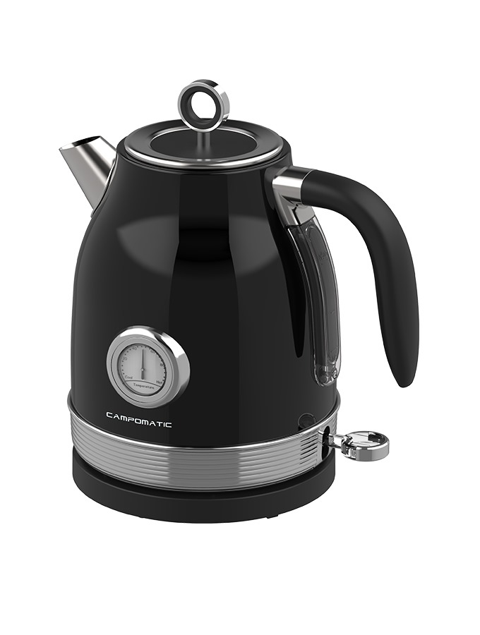 Campomatic,Retro Vintage Kettle, Black & Chrome Metal Body, Round Thermometer, 1.7L, 2200W, Auto Shut Off