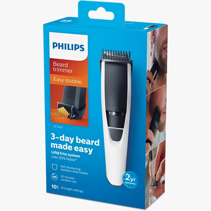 The Philips BT3206 Beard Trimmer Series 3000 is designed to give you an even and effortless trim every time. Featuring the Lift & Trim system, it captures and lifts low-lying hairs for efficient cutting in fewer strokes.