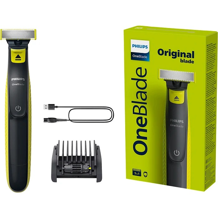 Philips,Unique OneBlade Technology , Trim, Edge, Shave , 5-in-1 Adjustable Comb , Each Blade Lasts 4 months , A Green Useage Indicator Will Appear Once The Blade Is Worn Out , Charge (Hr) : 8 , Cordless Use (Mins) : 45 , Protection Cap , USB-A