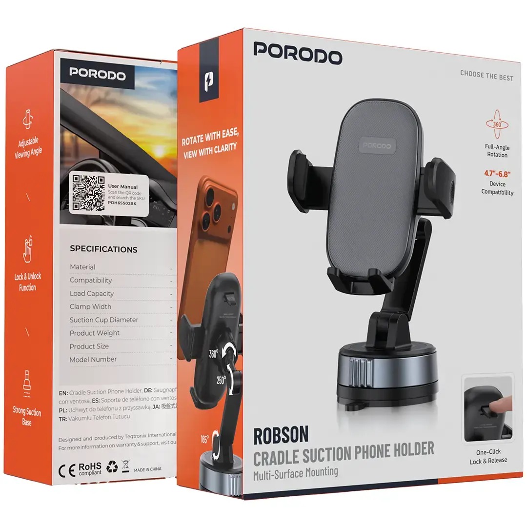 The Porodo Robson Cradle Suction Phone Holder – Black provides users with a straightforward method to securely affix their device. The product features a powerful suction base that enables it to create secure bonds with various surfaces while maintaining its grip during rough vehicle operation. The one-click locking mechanism of the device enables users to mount or dismount their phone with complete ease. Users can adjust their viewing angle through the adjustable viewing angle, which enables them to find their preferred viewing angle, while the 360° rotation function provides complete viewing angle control for both portrait and landscape display formats. The silicone clamp supports devices with widths between 52 mm and 90mm, making it suitable for different smartphone sizes. The product enables drivers to operate their vehicle without using their hands because of its lightweight design and simple control system. The Robson Cradle Suction Phone Holder offers users safe and easy-to-use functionality, whether installed on their car’s dashboard or window.